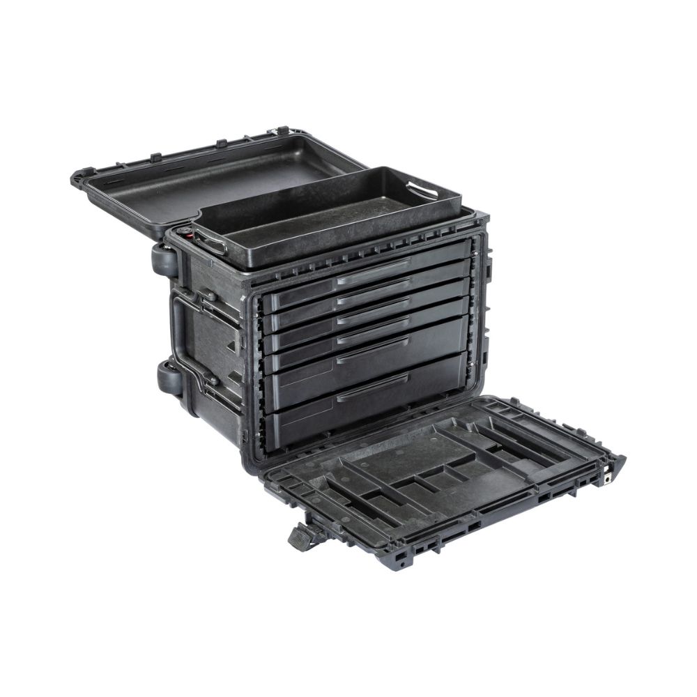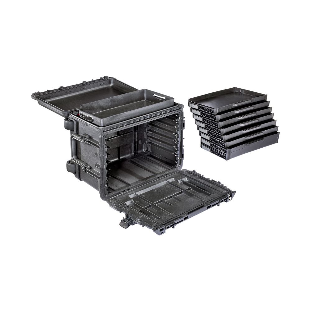O design reforçado foi testado para submersão em água, temperaturas extremas e quedas de até 1,5 metro. Este case suporta uso intenso mantendo suas ferramentas protegidas. Além disso, a alça retrátil e as rodas para terrenos irregulares reduzem o esforço no transporte.